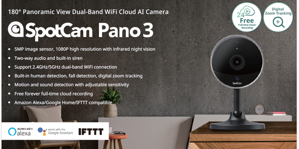1080P高解像度・180°パノラマビューカメラ搭載。動体検出機能、クラウド録画対応、屋内用防犯カメラ「SpotCam Pano 3」取り扱い開始