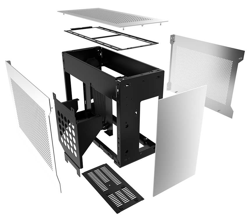 フロント、トップ、サイド、ボトムのパネルは取り外しが可能なので、ケーブル管理やメンテナンスが容易です。また、トップやサイドパネルにはパンチング加工を施しており、エアフローにも配慮しています。BlackとSilverの2モデルをラインナップしています。