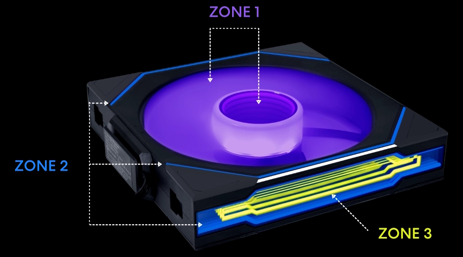 ファンの中央とフレーム側面にインフィニティミラーデザインを採用。フレーム側面では、両側面のインフィニティミラーデザインを異なるものにすることで、視覚効果のバリエーションを付けています。ライティングやファンの速度などは、専用ソフト「L-Connect 3」にて制御できます。