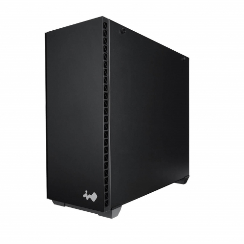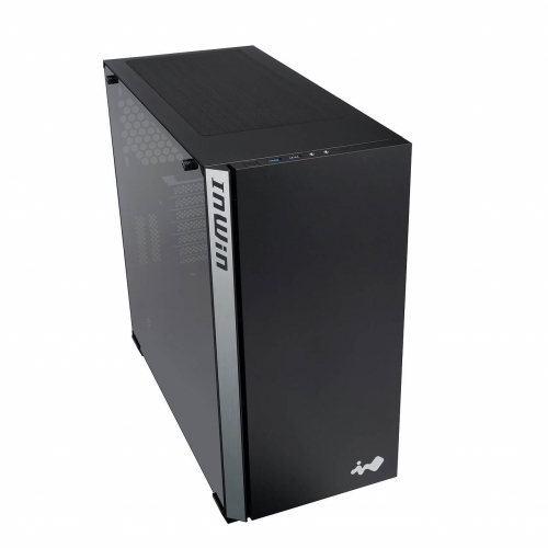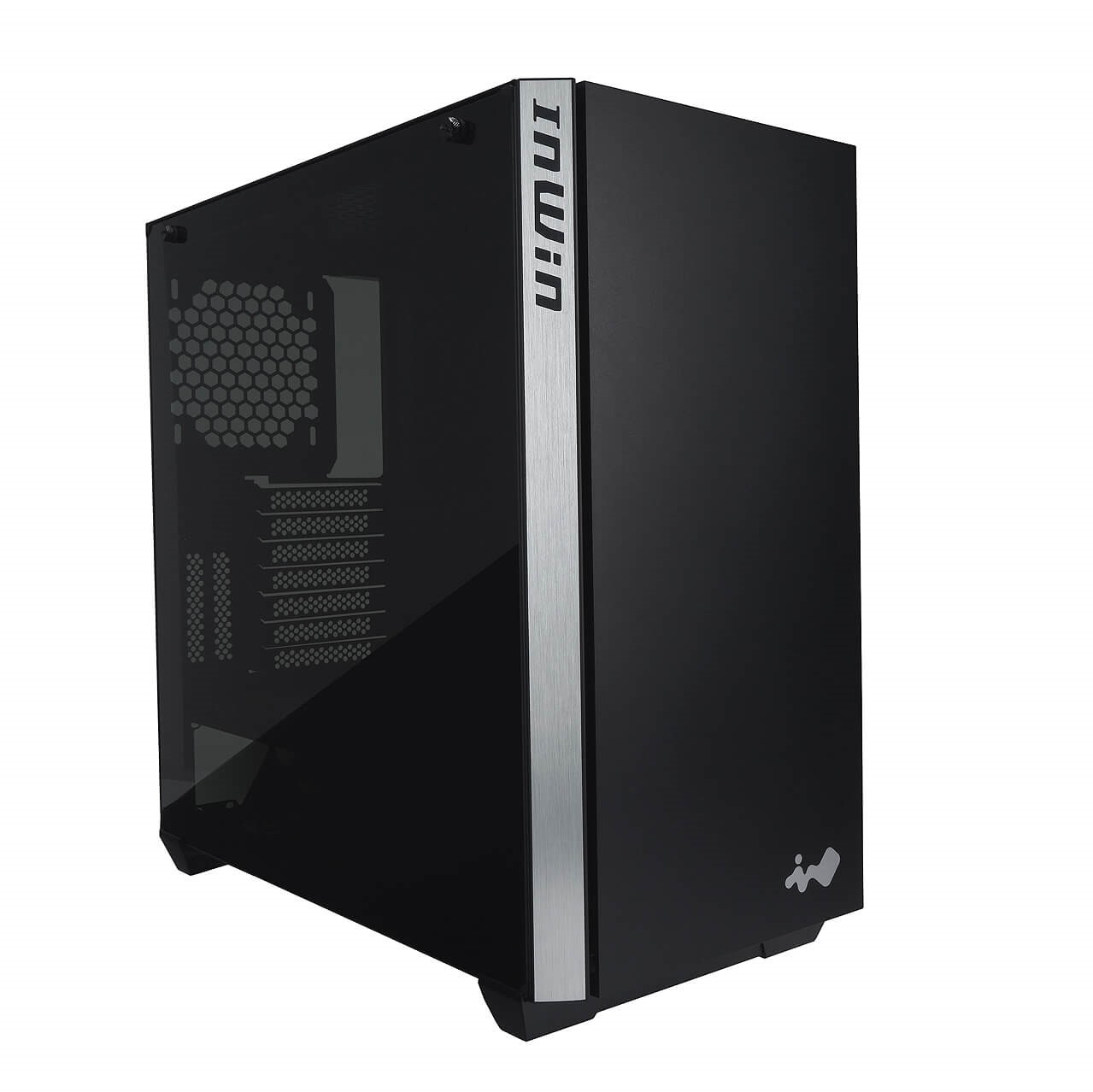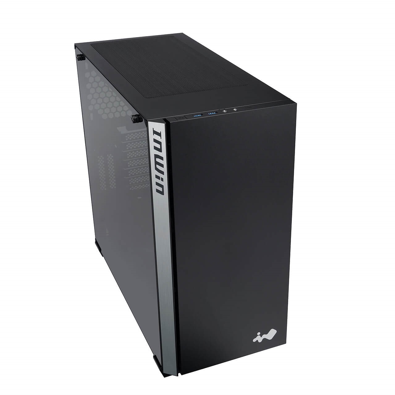 フロントパネル正面にはIN WINのマーク、ラインのようなフロント左側面にはIN WINのロゴをアクセントとして配するデザイン。フロントの深みのあるブラックと、側面のヘアライン加工による落ち着いたシルバーの組み合わせが見事に調和しています。シンプルかつ存在感のある仕上がりとなりました。