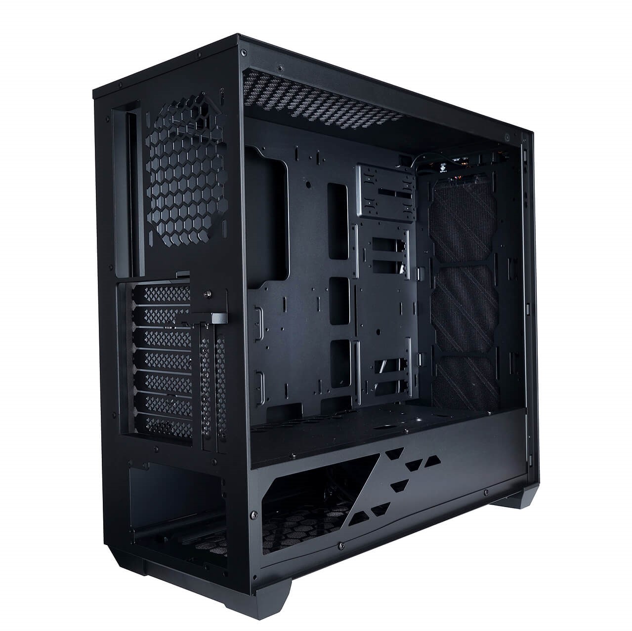ケースファンはフロントとトップ、リアに最大6基、ラジエーターはフロントに360mm、リアに120mmを搭載可能なので、さまざまな冷却システムを構築できます。また、効率的なエアーフローを実現するため、フロント側面には吸気口を設けています。