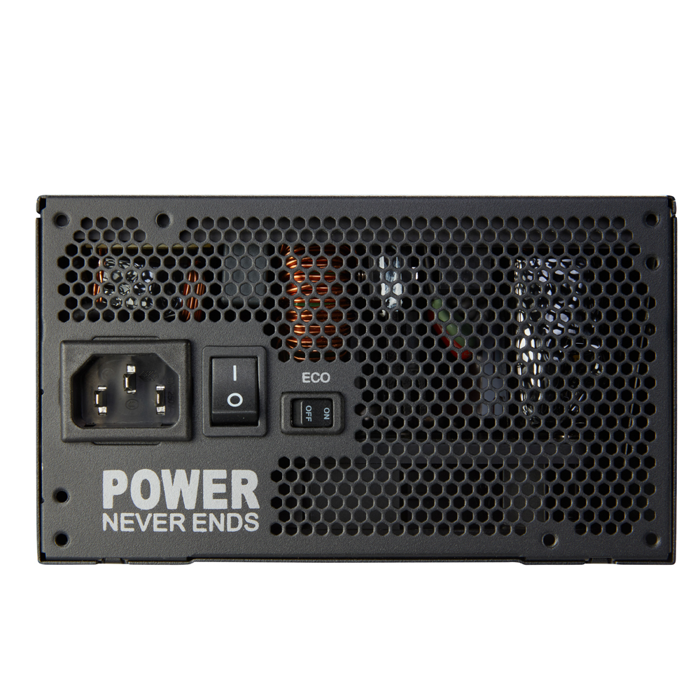 電源負荷が30%以下のときにファンの回転を自動で停止するECOセミファンレス機能を搭載(スイッチで機能のON/OFFが可能)。これにより、軽度な作業時であれば、電源ユニットはノイズを発しなくなります。