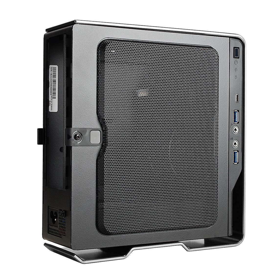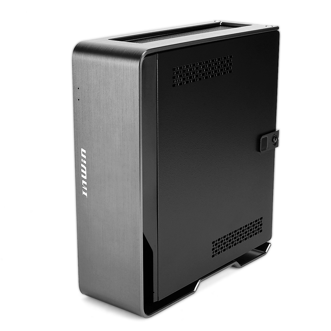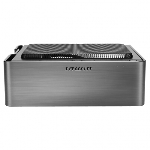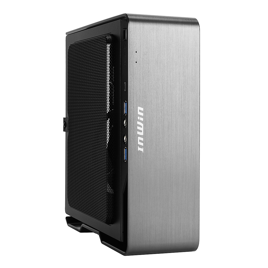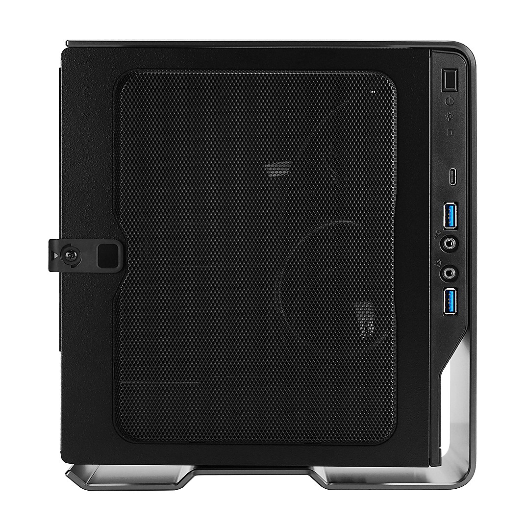 フォームファクターはMini-ITXで幅84mm×高さ244mm×奥行217mmのコンパクト設計。縦置き、横置き、どちらにも対応します。チタニウムグレーの4mm厚アルミニウムを採用した外装は、ヘアライン加工によりクールな質感を演出しつつも、丸みを帯びたカーブラインが柔らかな印象を与える、絶妙なバランスで仕上がっています。