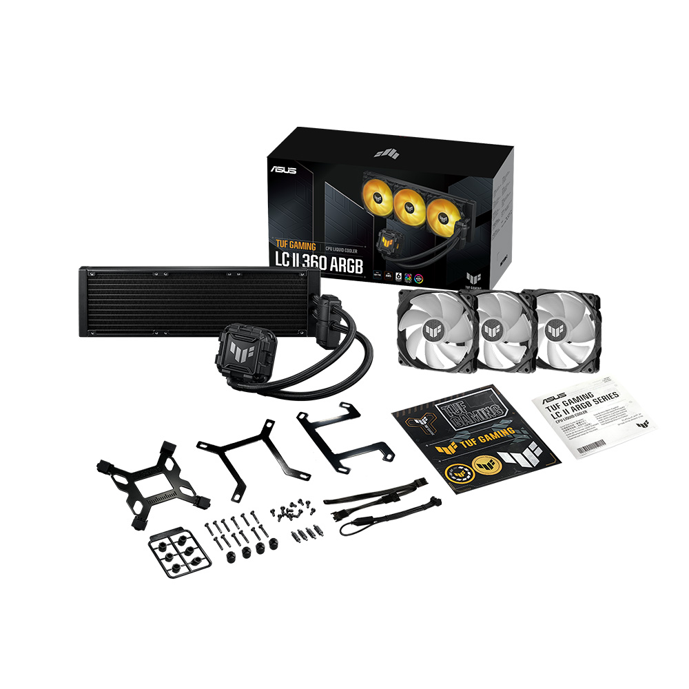 ※TUF GAMING LC II 360 ARGB AIOクーラー製品を購入する前に、お手元のマザーボードにポンプ用ARGB照明と付属のARGBファンを接続するための3-pin ARGBヘッダーがあることを確認してください。