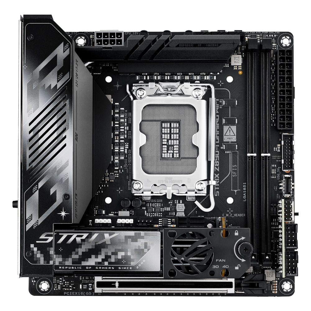 汎用性の高いROG Strix Z890-I Gaming Wifi Fan Bracketをご紹介します。このマザーボードのデュアルM.2スロットまたはDRAMスロットに30mmまたは40mmファンを追加した場合に、高いエアフローを確保できるように設計されています。コンパクトなゲーミングマザーボードにこのファンを追加することで、機能性とROGの特徴である美しさを兼ね備え、様々な冷却ニーズに対応することができます。