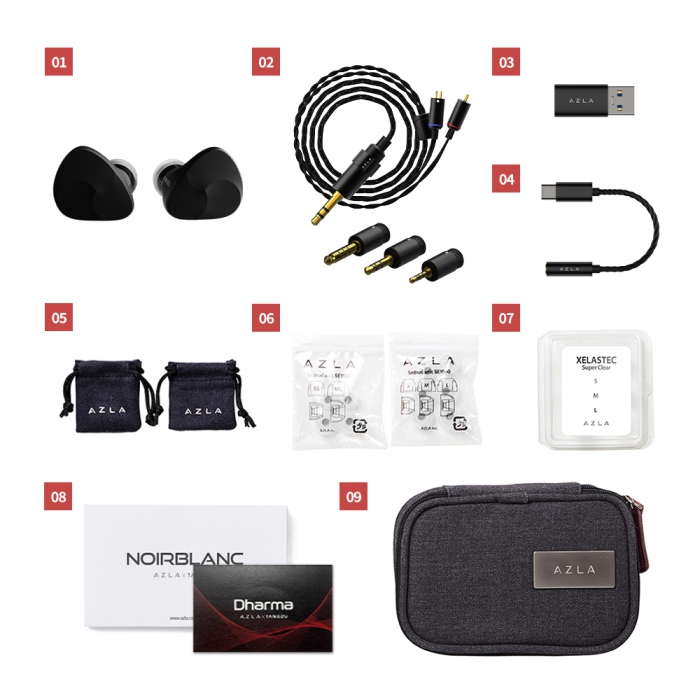『NOIR BLANC』は、AZLAとTANGZU、両社のサウンドエンジニアが約1年の共同作業によって完成させたユニバーサルIEMです。AZLAが追求する空間表現とTANGZUの優れたサウンド表現力をかけ合わせ、ナチュラルな楽器音の再現に注力しました。繊細なサウンドのBAドライバー3基に、ダイナミックドライバー1基を使用したハイブリッド構成を採用。ダイナミックドライバーには、軽量かつ高剛性のカーボン複合振動板と音の歪みを低減するデュアルキャビティ構造、レアアース磁石とも呼ばれる強力なネオジム磁石N52を採用し、優れたサウンドレスポンスを実現しています。また左右それぞれのユニットを最先端の設備にてバランス測定を行うことで、優れた位相特性と定位感も実現。さらに滑らかで自然な高音域を表現するフィボナッチフィルターを採用。ハウジングにはアルミニウムを採用し不要な共振を抑制します。調和を象徴するフェイスプレートデザインとオールブラックカラーで、シックなデザインに仕上げました。