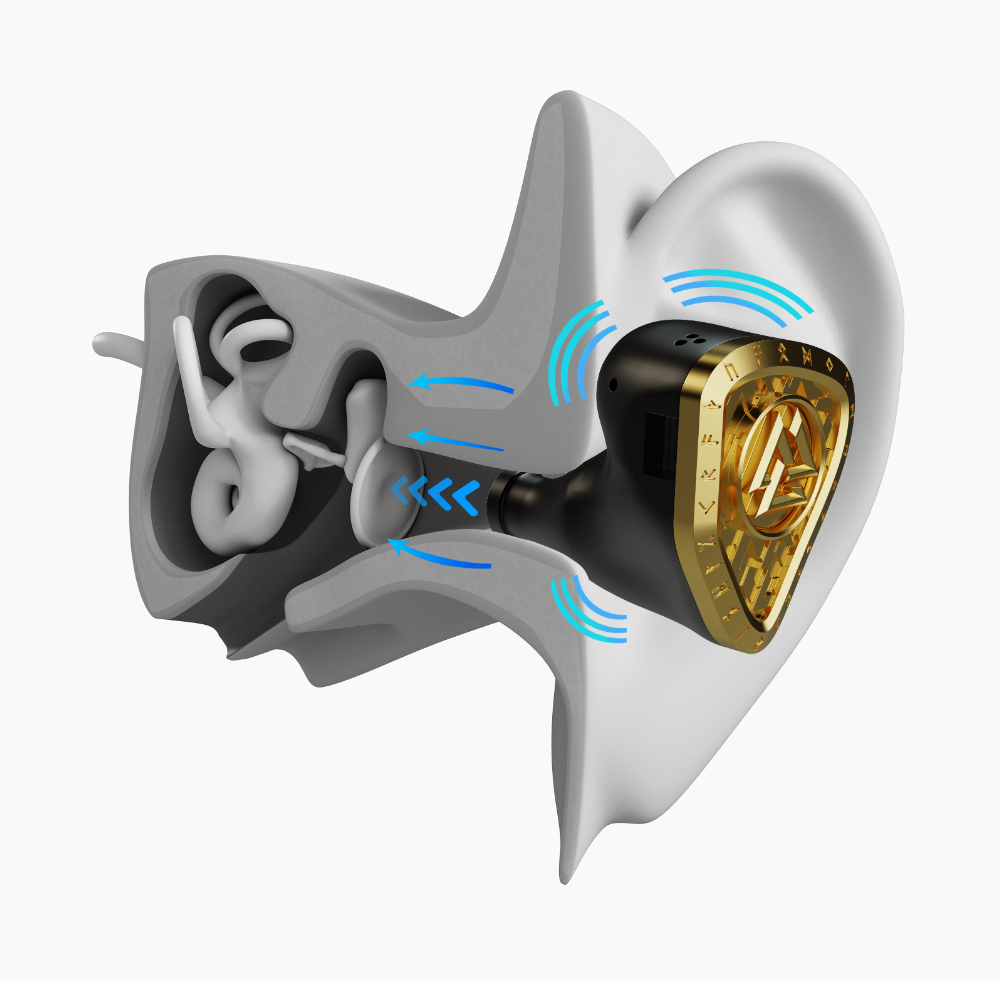 デュアルコンダクションアーキテクチャーによって両者の長所を共に引き出します。フルレンジの周波数特性は、ダイナミックドライバー、BAドライバー、静電ドライバーの空気伝導によって再生され、イメージング、サウンドステージ、ディテール、低域拡張、リバーブは骨伝導ドライバーによって特に5Hz~40KHzの周波数帯において更に向上します。