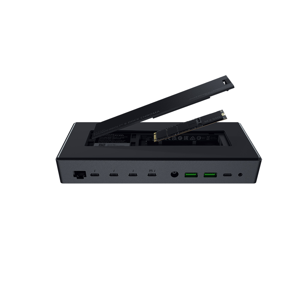 Razer Thunderbolt™ 5 Dock Chroma は、進化する現代のワークステーションやゲーミング環境のニーズに応えるために設計されました。3 台の4K ディスプレイを同時にサポートし、高速データ転送に対応、M.2 用ストレージスロットを備えたこのドックは、多彩な機能をひとつの効率的なハブに集約しています。大容量のメディアファイルを扱うクリエイターから、スマートで高性能な環境を求めるゲーマーまで、幅広いユーザーの複数デバイスによる作業を支援する、豊富なポート構成とThunderbolt Share 機能を搭載した多用途なソリューションです。