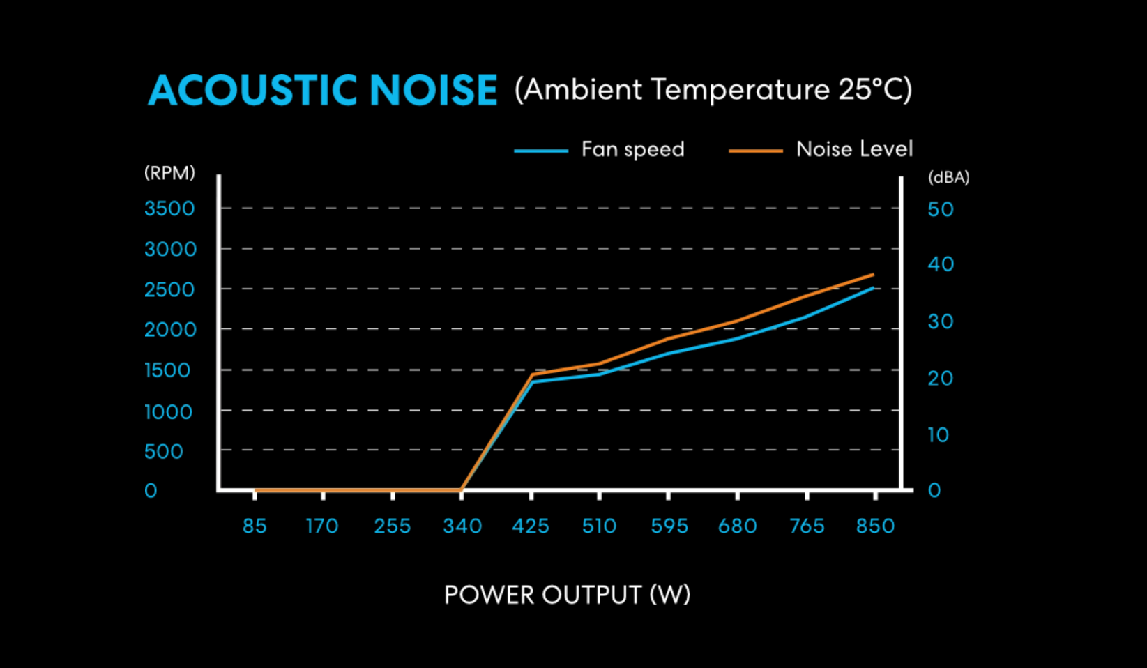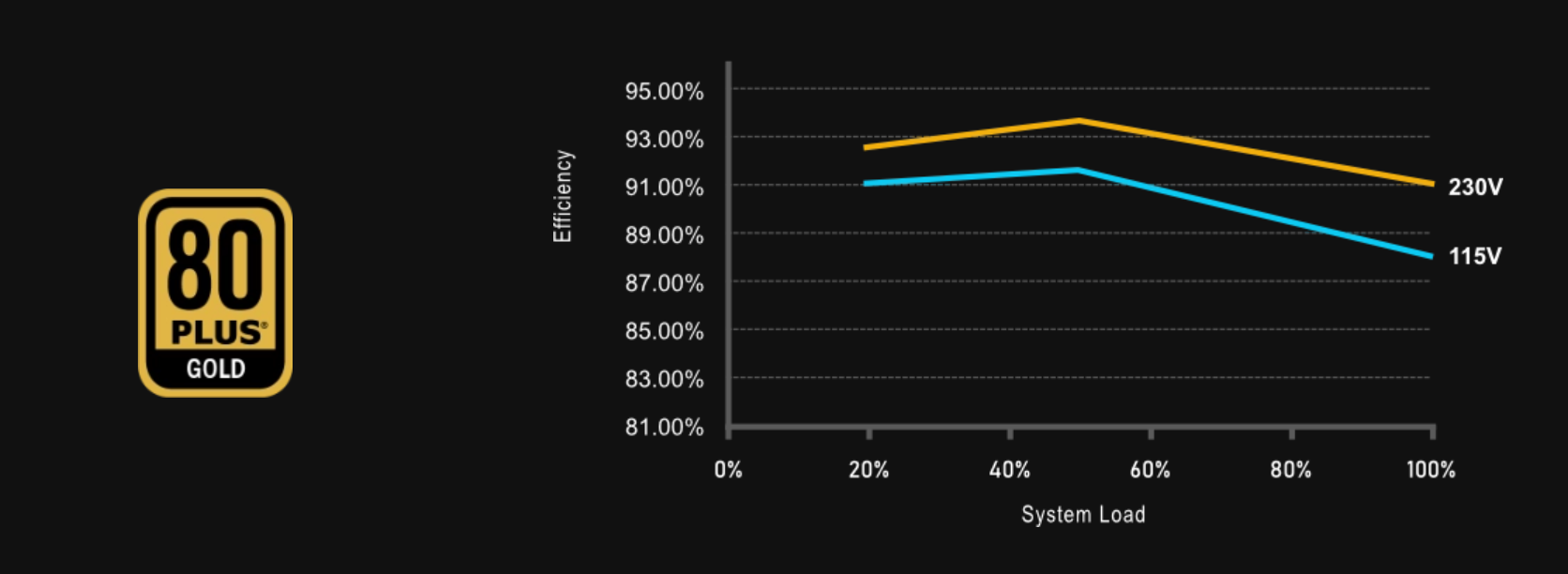 80PLUS Gold 認証を取得した SP V2 は、115V AC入力条件下で50%のシステム負荷時に 90% を超える効率を実現し、安定した電力供給と最小限のエネルギー損失で高いエネルギー効率を保証します。