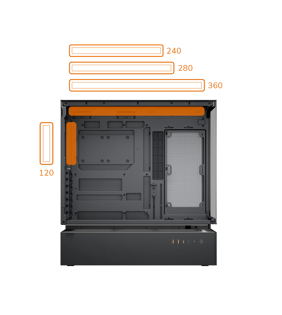 マザーボード横には、一体成型ファン「UNITY 240 ARGB REVERSE BLADE」を標準搭載。リアには120mm ARGB PWMを1基標準搭載しており、上部エリア底面に設けられたLEDストリップとともにケースを美しく彩ります。