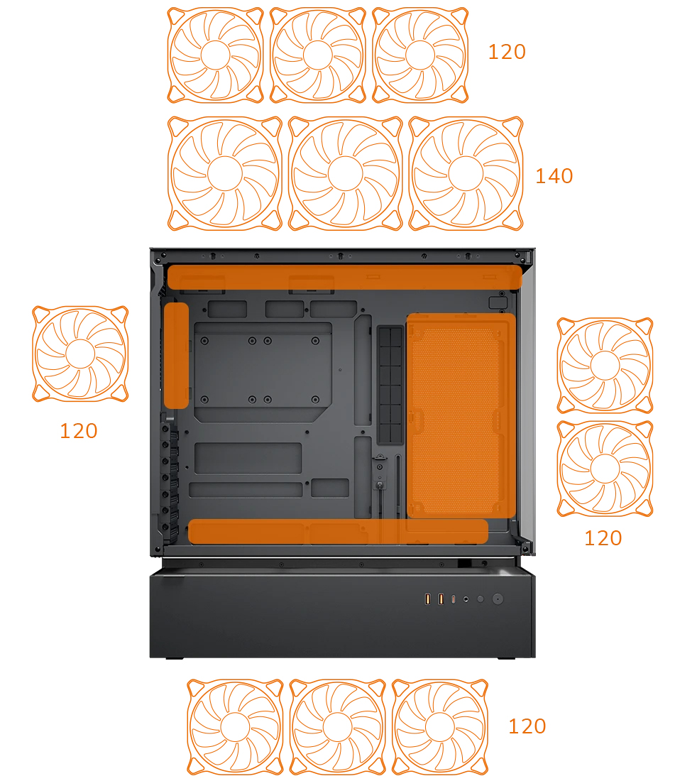 メインチャンバーと電源ユニットを収納するキャビンを上下に独立させ、その間の空間から吸気を行なうことで、効率的なエアフローを実現します。1.5mm厚の堅牢なスチールフレームにより、上部メインチャンバー部が宙に浮いているような独創的なデザインを可能としています。