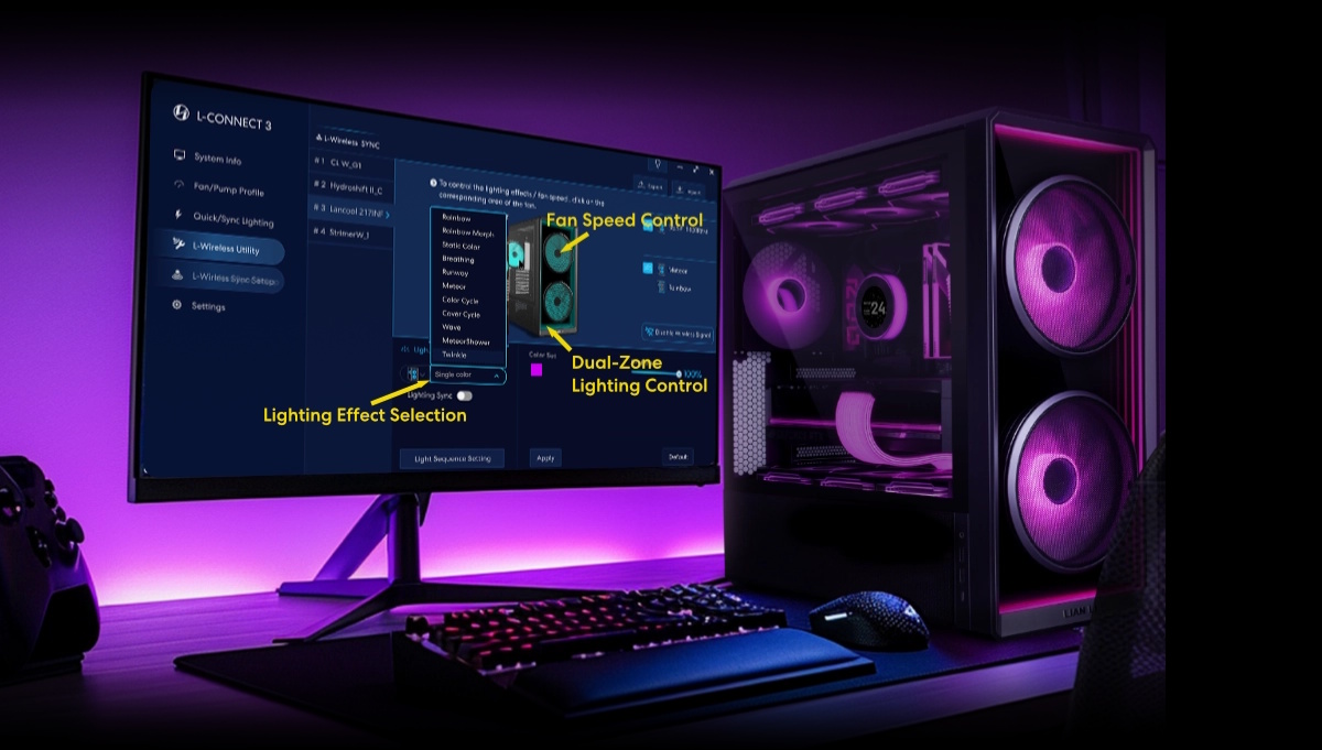 別売のWirelessコントローラー(ドングル)を使用すれば、専用ソフト「L-Connect 3」でのコントロールが可能になります。