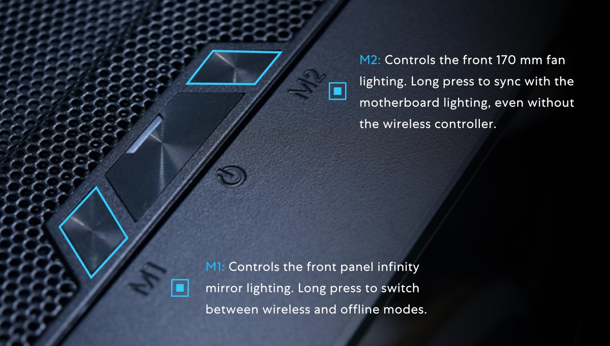 ケースのI/Oボタンにて、フロントパネルとフロント搭載ファンのARGBライティングを制御できます。また、マザーボードSyncモードに切り替えて、マザーボード側で制御も可能です。