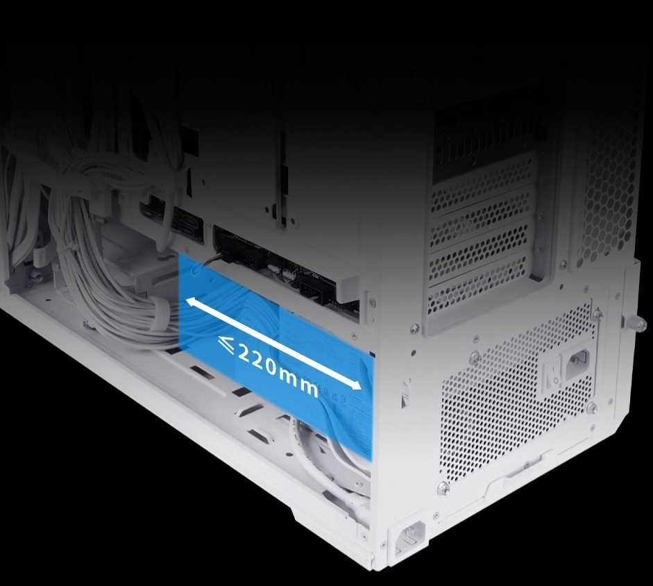 PSUコネクタが前面を向いている場合、最大220mmの長さのATX PSU をサポートし、ほとんどの標準的なインストールに適しています。