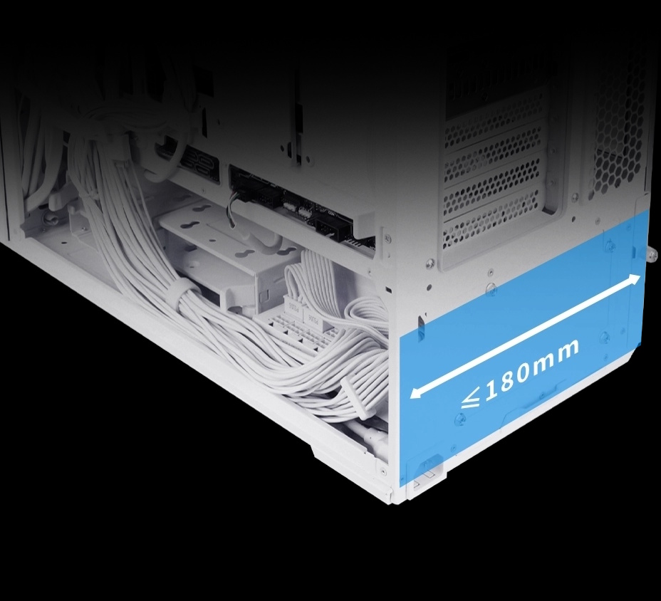 電源ユニットを90°回転させ、コネクターを右側に向けると、最大180mmの小型電源ユニットに対応します。ケーブル配線スペースが最適化され、ファンが電源ユニットを直接冷却するため、冷却効率が向上します。