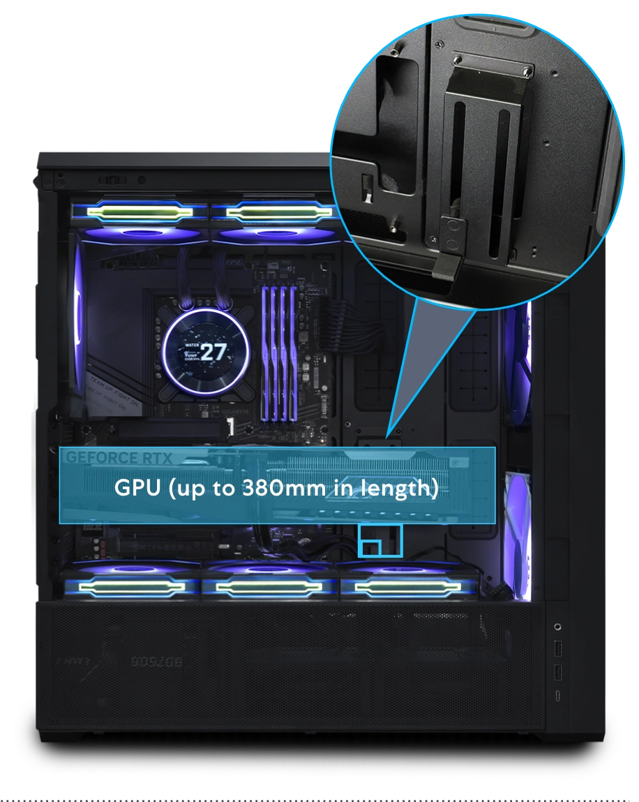 長さ380mmまでのグラフィックカードをサポート。大型のグラフィックカードを支えるため、調整可能なたわみ防止ブラケットを備えています。