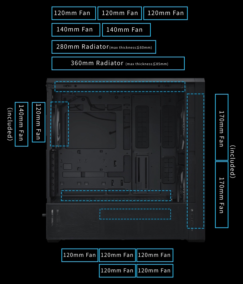 ※LANCOOL 217 INFには、170mmファン×2、140mmファン×1を標準搭載しています。120mmファンの増設については、別途ファンをご用意ください。