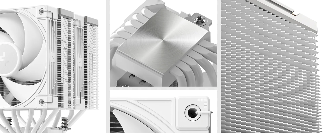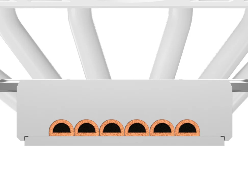 精密加工された銅製ベースと6本の銅製ヒートパイプ、冷却フィンを高密度に配置したマトリックスデザインのデュアルタワー型ヒートシンクを組み合わせ、高い冷却性能を発揮します。ファンやヒートシンク、ヒートパイプはそれぞれブラックまたはホワイトカラーで整えられています。