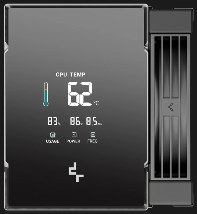 4つのセグメント(CPU温度、使用状況、消費電力、周波数)をモニタリング可能なLCDを天面に搭載。USB 2.0ヘッダーに接続することで専用ソフト「DeepCreative」により制御可能です。CPU温度に応じて、左側のインジケーターが段階的に色を変化させる警告機能も備えています。