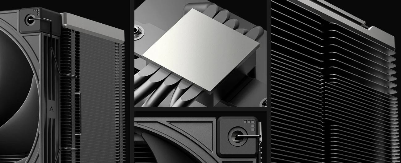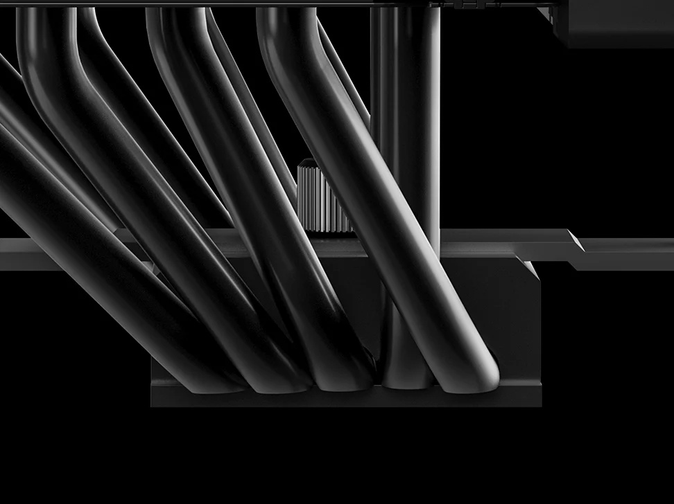 精密加工された銅製ベースと 5本の銅製ヒートパイプ、冷却フィンを高密度に配置したマトリックスデザインのシングルタワー型ヒートシンクなどを組み合わせ、高い冷却性能を発揮します。ファンやヒートシンク、ヒートパイプはブラックカラーで整えられています。