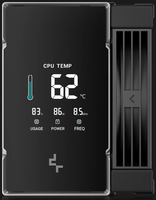 4つのセグメント(CPU温度、使用状況、消費電力、周波数)をモニタリング可能なLCDを天面に搭載。USB 2.0ヘッダーに接続することで専用ソフト「DeepCreative」により制御可能です。CPU温度に応じて、左側のインジケーターが段階的に色を変化させる警告機能も備えています。