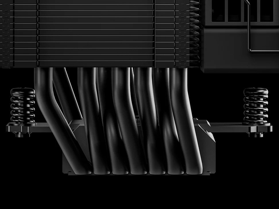 精密加工された銅製ベースと 7本の銅製ヒートパイプ、冷却フィンを高密度に配置したマトリックスデザインのシングルタワー型ヒートシンクを組み合わせ、高い冷却性能を発揮します。ファンやヒートシンク、ヒートパイプはブラックまたはホワイトカラーで整えられています。