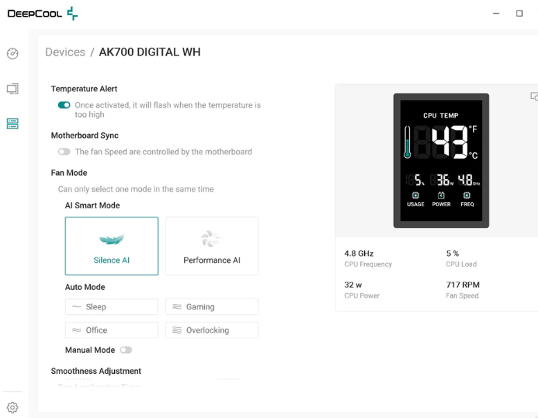 DeepCreativeの独自のAIアルゴリズムがCPUの負荷をリアルタイムで追跡し、最適なファン速度を自動的に調整します。負荷に応じて静音性とパフォーマンスを自動的に調整するAIスマートモード、 状況に応じたプリセットモード(スリープ・オフィス・ゲーミング・オーバークロック)をシームレスに切り替え可能です。これらの設定は「DeepCreative」上から行うことができます。