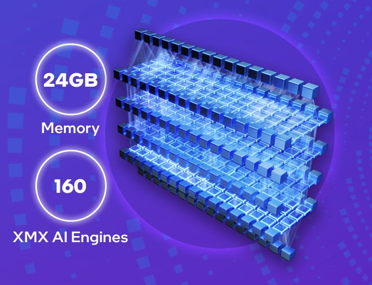 24GBの専用メモリー、最大456GB/sの帯域幅、160基のXMX AIエンジンを備え、AI生成デザイン、3Dシミュレーション、レイトレーシング、編集タスクなどの最新のプロフェッショナルプロジェクトの要求に対応します。