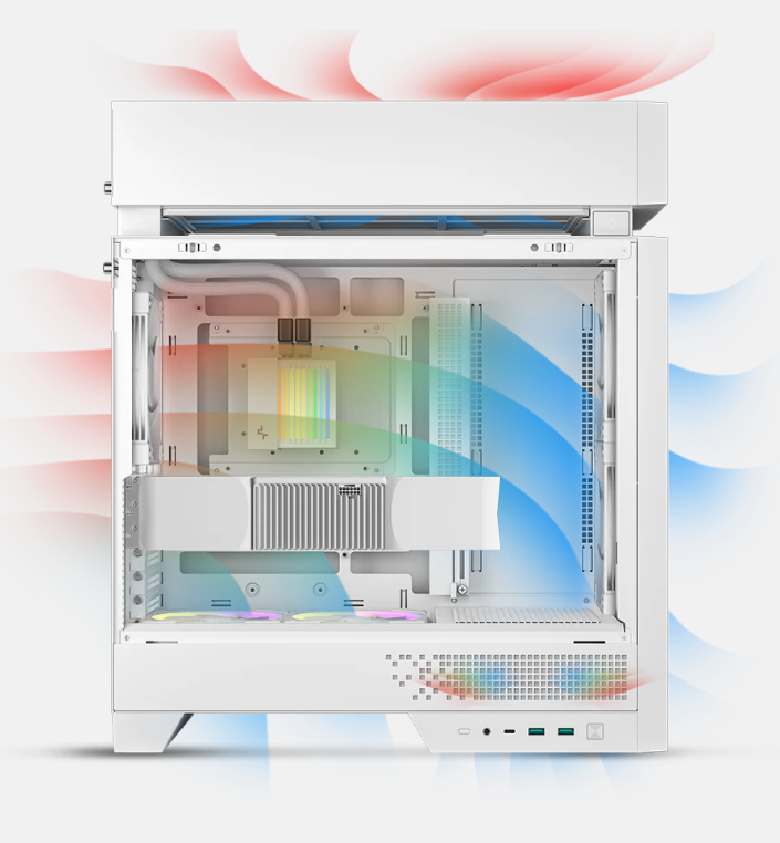 CPU・GPU・PSUの主要熱源ごとにゾーンを独立する形で分離し、エアフローを分断することで、従来レイアウトでは避けられなかった熱の滞留や干渉を防ぎ、ケース全体の冷却性能を飛躍的に高め、内部レイアウトも整理された美しい状態を維持します。ケーストップ部にラジエーター専用の分離したトップチャンバーを設置し、水冷クーラー専用の吸気・排熱スペースを確保することで、ケース全体の冷却性能を飛躍的に高め、内部レイアウトも整理された美しい状態を維持します。
