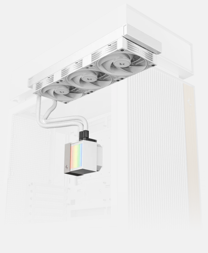 独自のショートチューブ設計を採用し、本ケース向けにデザインされた360mm水冷クーラーを標準搭載。効率性と静音性を両立した高性能ポンプや、安定したエアフローを構築するFDBファンを搭載し、高い冷却性能を発揮します。