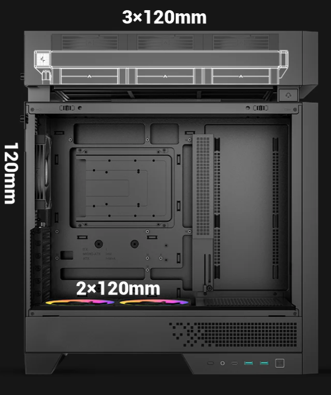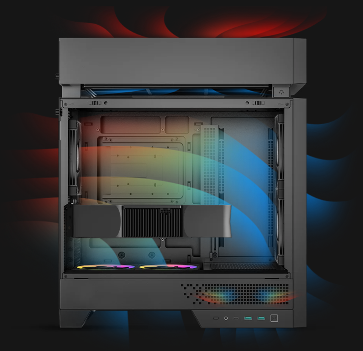 ケーストップ部にラジエーター専用の分離したトップチャンバーを設置し、水冷クーラー専用の吸気・排熱スペースを確保することで、ケース全体の冷却性能を飛躍的に高め、内部レイアウトも整理された美しい状態を維持します。ケースボトムにはGPUの冷却用に120mm ARGBリバースブレードファン「FL12R SE」を2基標準搭載。さらに、GPUとPSUにも独立したエアフローを確保し、優れた冷却性能とクリーンな内部レイアウトを実現しています。
