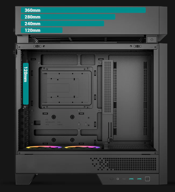 最大8基の120mmケースファン搭載可能、360mmラジエーター(ケーストップ部)への対応により、強力な冷却システムを構築することができます。