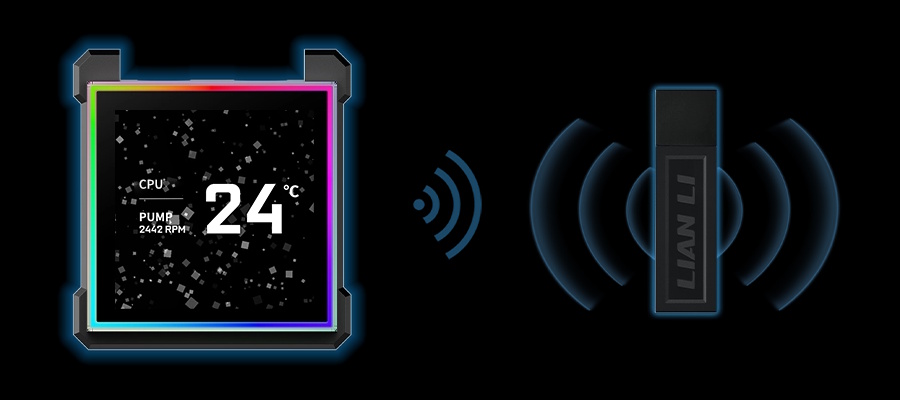L-Wireless 2.4Gコントローラーを介して接続することで、L-Connect 3経由で画面テーマ、パラメータ、ライティングエフェクトをカスタマイズできます。ワイヤレスモードでは、CL WirelessやTL Wirelessなどの他のワイヤレス製品とのライティング同期も可能で、マザーボードのUSB 9Pポートを他のデバイス用に空けておくことができます。ケーブルの煩雑さを軽減し、システム負荷を最小限に抑えた、よりクリーンなセットアップをお楽しみください。