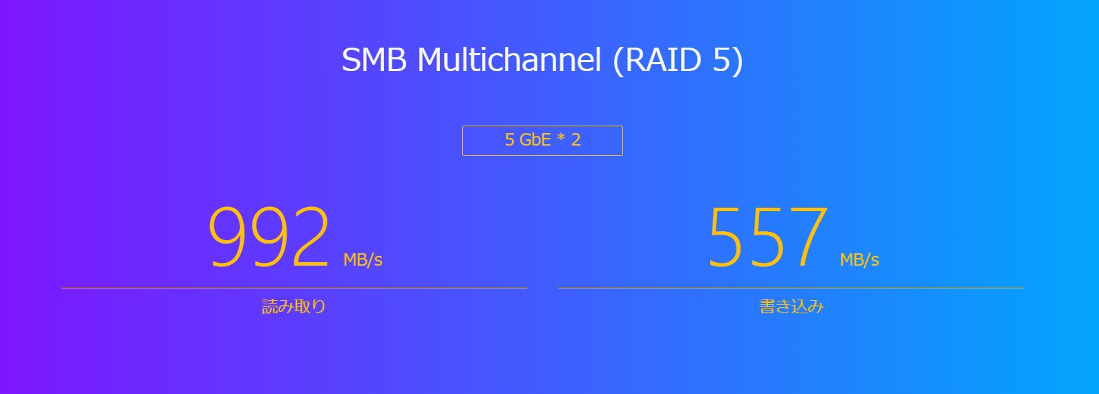 LOCKERSTOR 6 Gen2+は、デュアル5ギガビット・イーサネットポートを搭載し、実質的に利用可能な帯域幅を拡張します。SMBマルチチャンネルを活用することで、転送速度を約2倍にします。