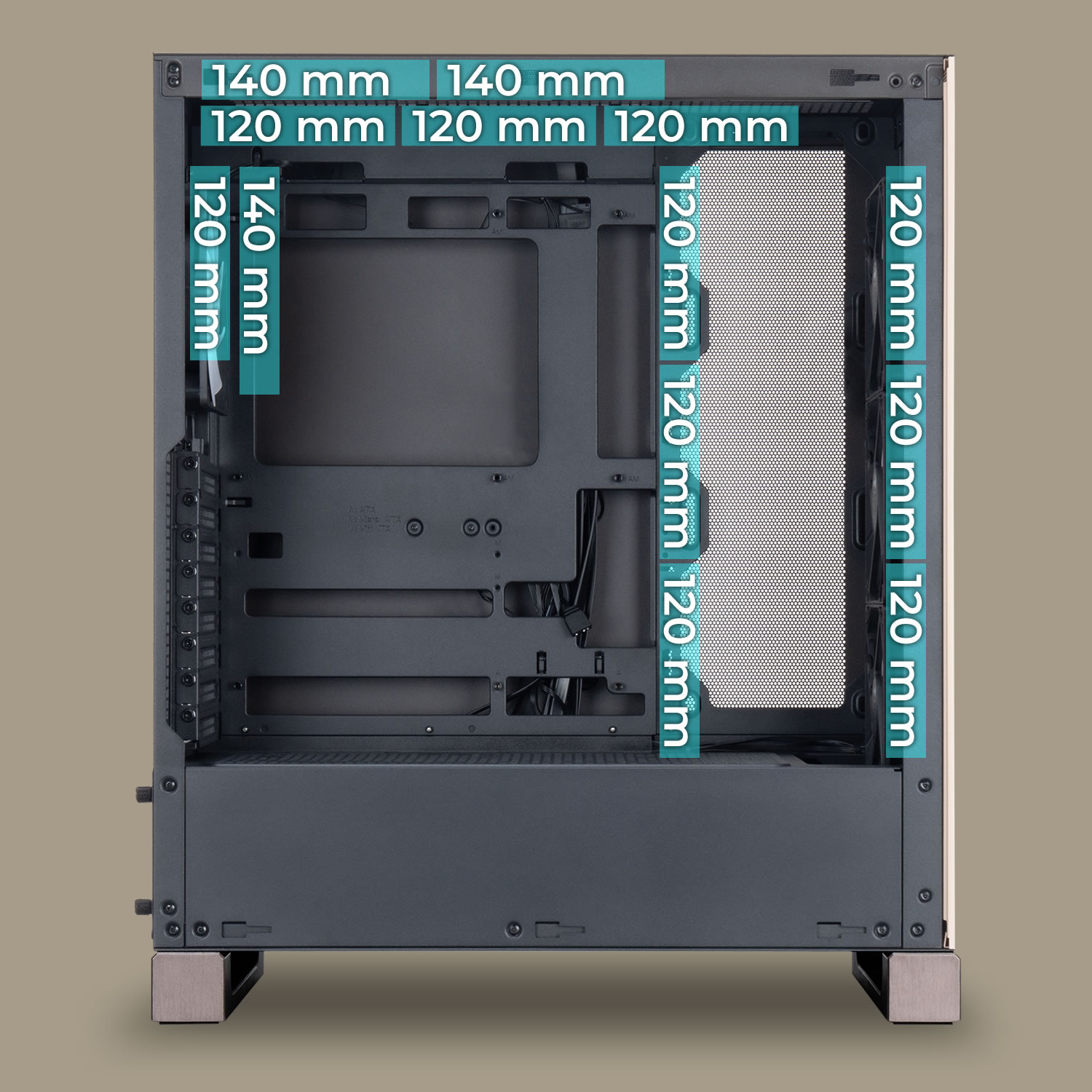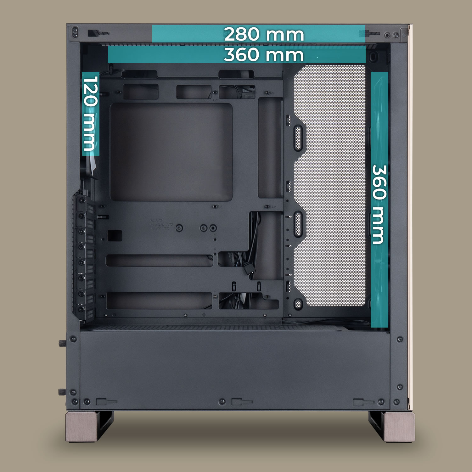 120mmのケースファンを最大12基搭載可能。水冷クーラーは最大360mm搭載可能です。