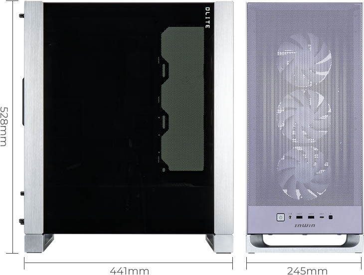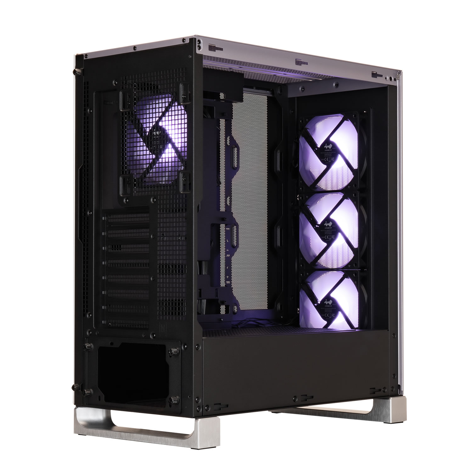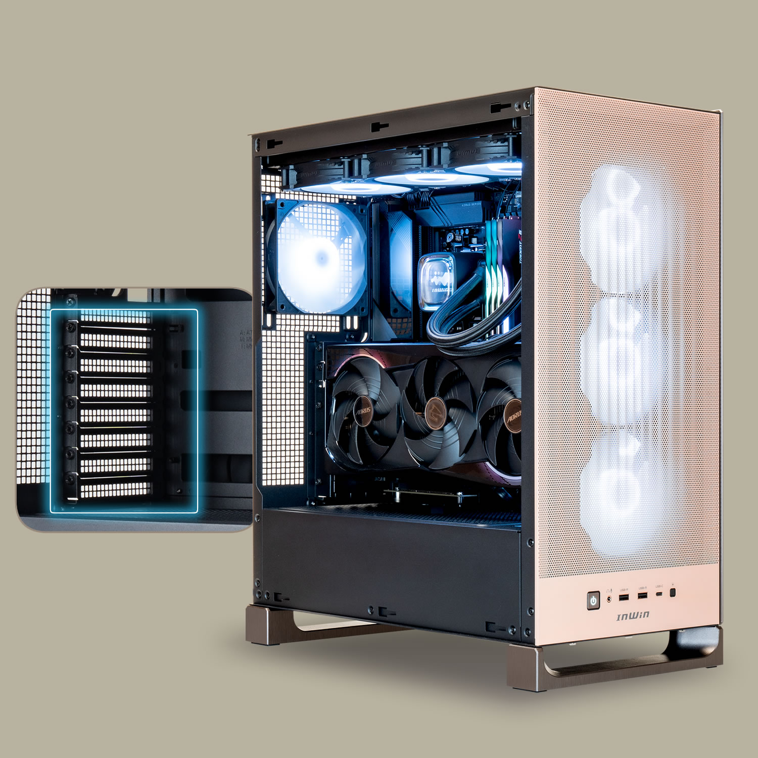 「DLITE」は8つのPCIeスロットを装備し、グラフィックカードは最大380mmサポート。120mmケースファンは最大12基*、水冷クーラーは最大360mmの搭載を可能にし、ハイエンドの構成に対応。120mm ARGBファン「XM120」をフロントに3基、リアに1基標準搭載しています。