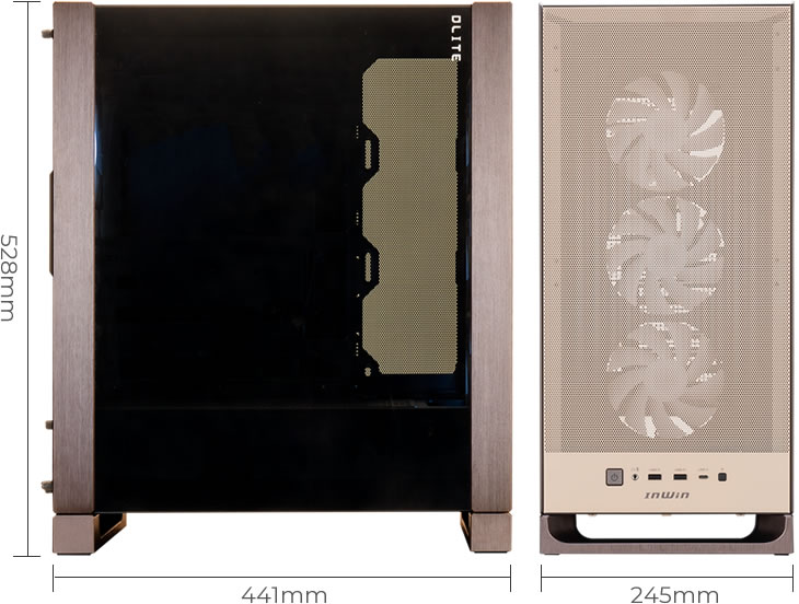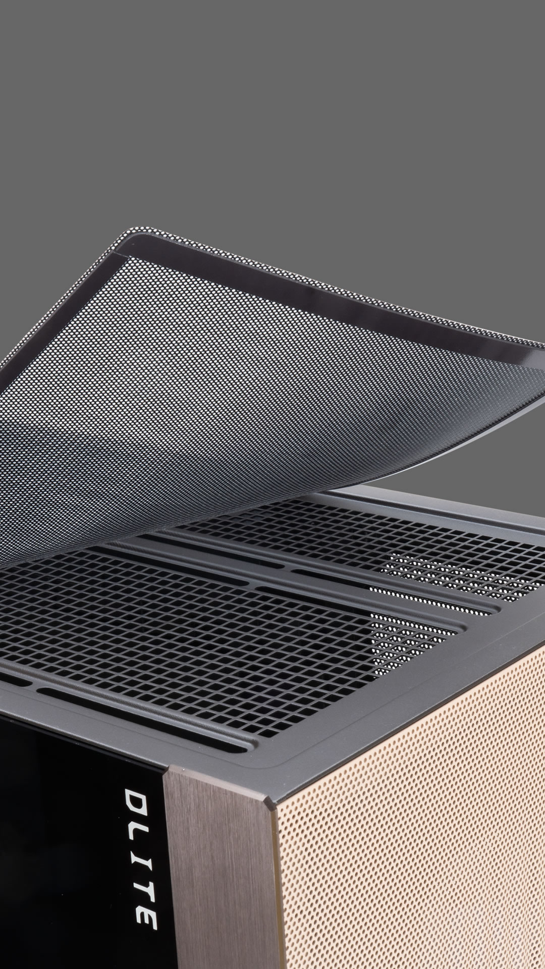 フロントパネルに細かいパンチング加工をしており、エアフローを最適化します。パネルの真ん中付近には波状の凹凸加工を施しており、左側面のヘアライン仕上げによる3㎜厚アルミニウムプレートやグレーに着色したサイドパネルと組み合わせることでエレガントな雰囲気を演出しています。