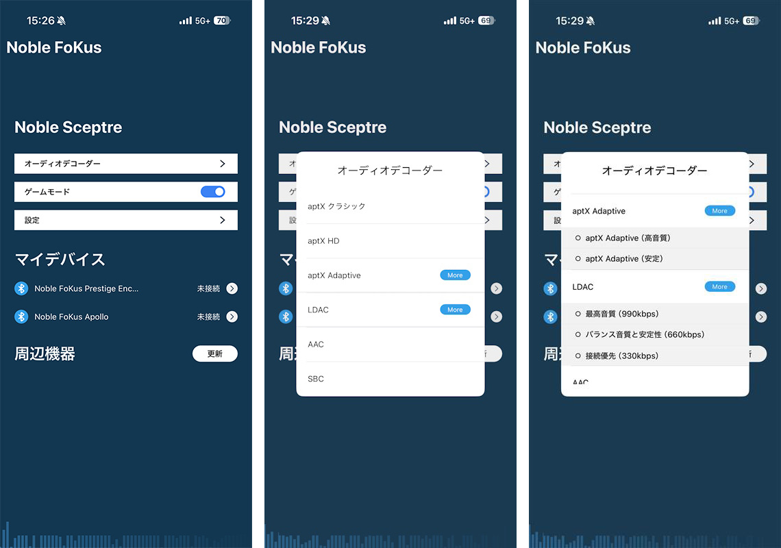 aptX AdaptiveやLDAC対応のワイヤレス機器をSceptreとペアリング時に、Noble FoKusアプリにaptX AdaptiveやLDACの表示が出ない場合は、ワイヤレス機器側の専用アプリにて対応コーデックの制限がされている可能性がありますので、その際は一度ワイヤレス機器側の専用アプリの設定をお確かめください。