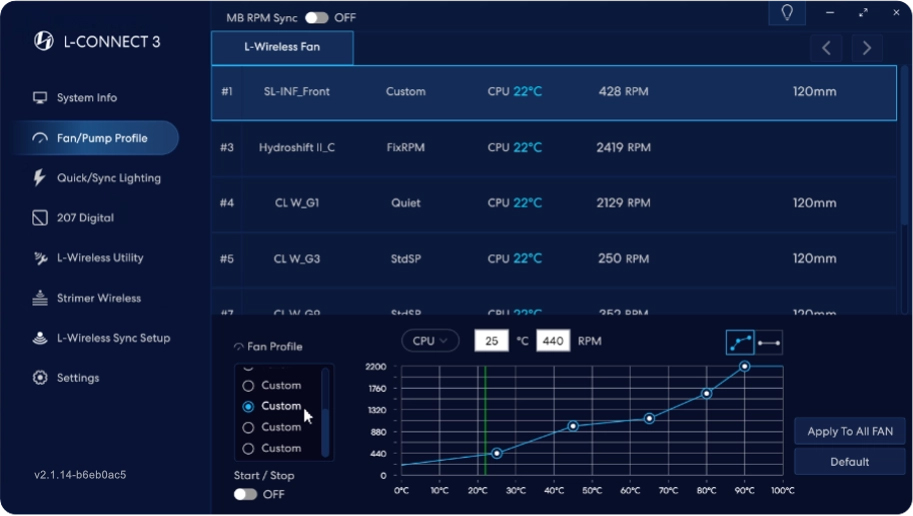 専用ソフト「L-Connect 3」にて、ライティング効果、ファンの速度などを制御できます。詳しくはこちら