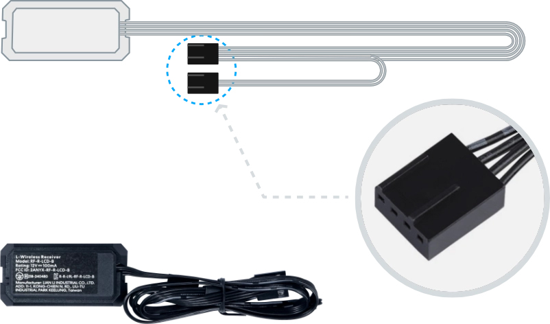 UNI FAN SL-INF Wirelessには、4V電源供給とBIOSファン検出のためのアップグレードされた12ピンPWMケーブルを備えたワイヤレスレシーバーが搭載されています。レシーバーには、安定した電力供給を確保するためのPWMテールケーブルも付属しています。