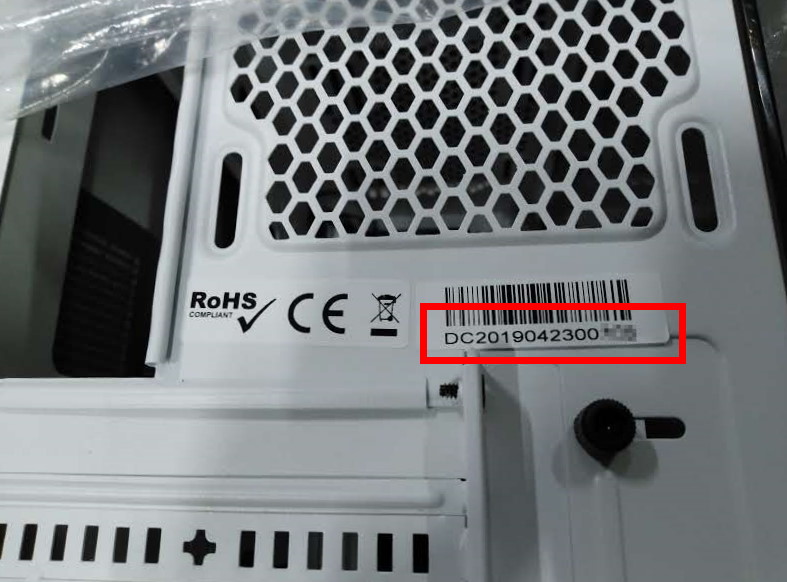 PCケース製品のシリアル番号は、ケース背面や拡張スロットそばに貼ってあるバーコードに記載されています。