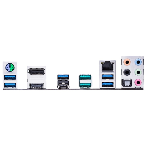 | Back Panel I/O Ports | 1 x PS/2 Keyboard/Mouse Combo port 1 x DisplayPort 1 x HDMI port 1 x Intel LAN (RJ45) port 2 x USB 3.1/3.0/2.0 ports (teal blue, Type-A) 1 x USB 3.0/2.0 ports (Type-C) 5 x USB 3.0/2.0 ports (blue,Type-A) 1 x Optical S/PDIF out 5 x Audio Jacks(Line in,Front Speaker Out,Mic in,Center/Subwoofer,Rear Speaker Out) |