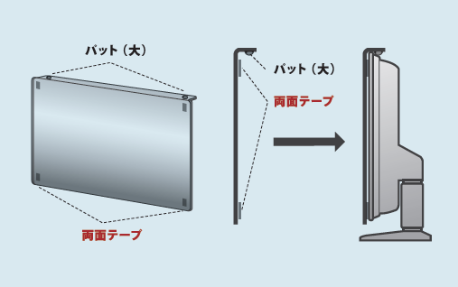液晶テレビ/モニターの上部に引っ掛け、付属のシリコンパッドや両面テープで固定するだけなので、取り付けが簡単です。厚さ2mmの頑丈なアクリル製のハードタイプで、お子様の落書き、手からすり抜けたゲーム用リモコン、掃除機の接触、ペットの引っ掻きなど、液晶画面を傷や衝撃から守ります。
