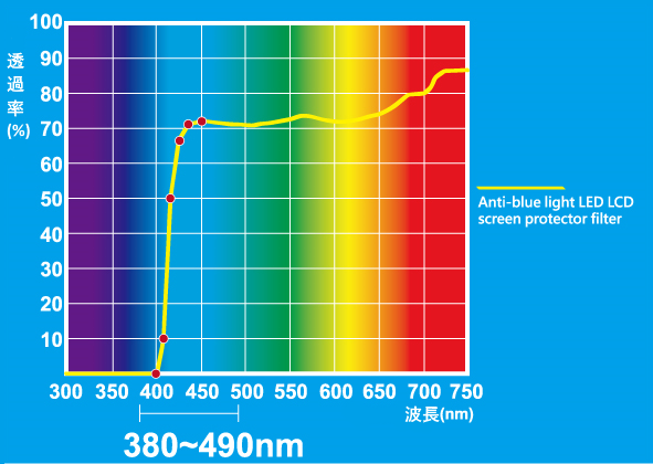 ブルーライトを平均で70%以上カット。410nmまでの光線は90%以上カット