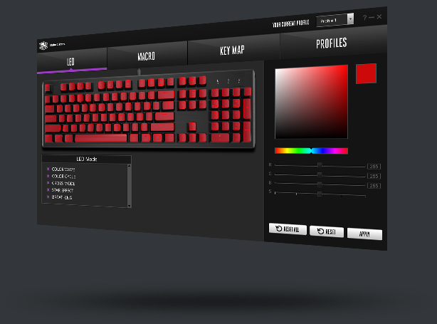 各キーに1670万色の中から好きな色を割り当てたり、ライティングモードのカスタマイズや、マクロの微調整など、各種設定を簡単に行うことができるソフトウェアをホームページ上から入手できます。