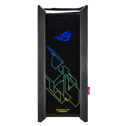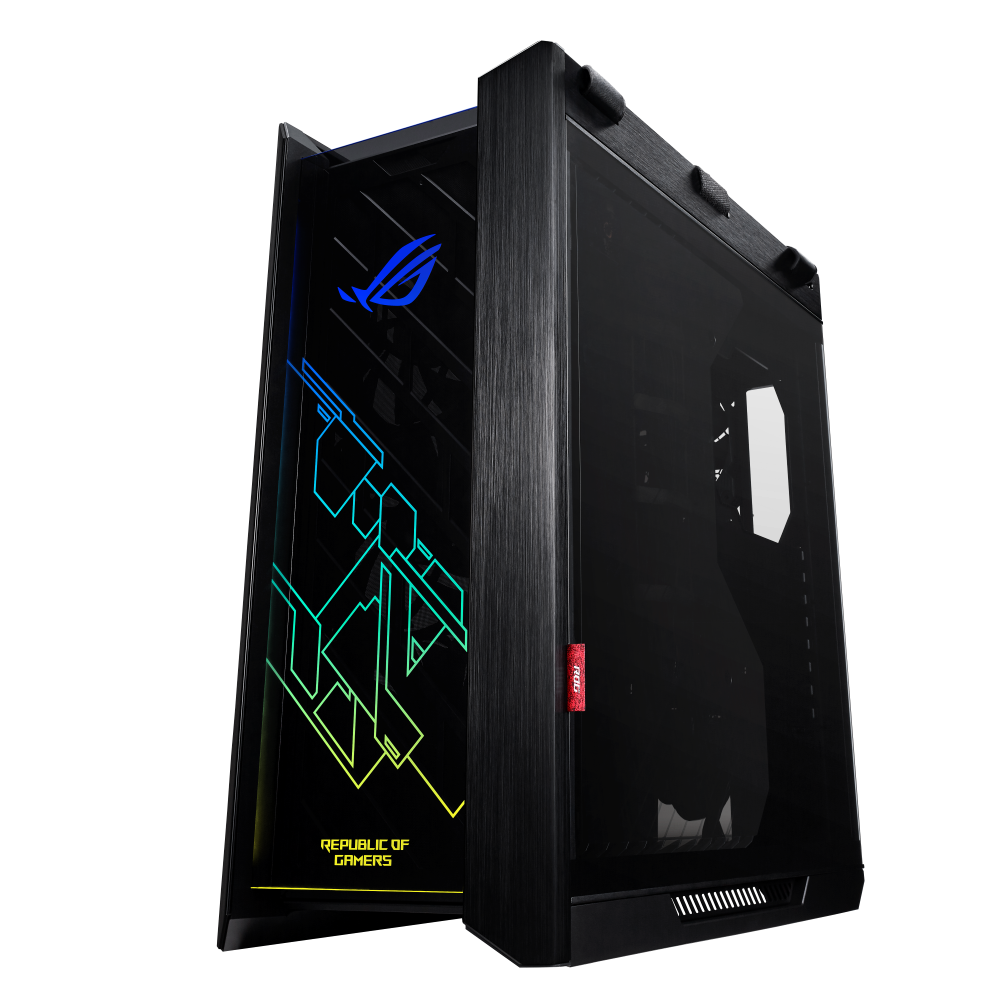 ROG Strix Heliosは、洗練されたつや消しアルミニウムフレームに3つの4mmスモーク強化ガラスパネルを取り付けたショーケース用に作られています。ダイナミックRGBライティングのディスプレイは、輝きを際立たせるためにフロントパネルに統合されています。