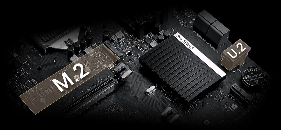Pro WS C246-ACEは、最大32 GbpsのM.2およびU.2を特長とし、より速いデータ転送速度を実現 - オペレーティングシステムまたはアプリケーションドライブに最適です。