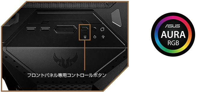 統合型の6つのポートのAura SyncアドレサブルRGBコントローラーハブと、フロントパネル専用コントロールボタンで魅力的なライティングエフェクトを実現できます。