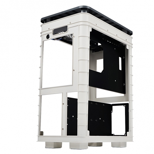 ケース底部から上部に向けて空気が流れ、トップに設置する防塵カバーとケースの間より排気されるよう設計されており、エアーフローを充分確保しています。また、4面をオープンフレームにすることで、冷却性を高めています。