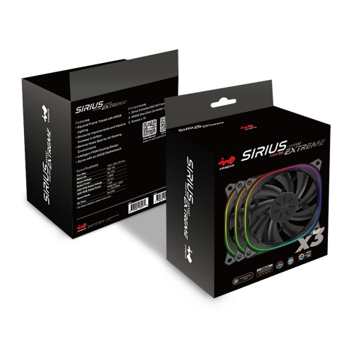 「Sirius Extreme」では、独自設計の鎌形ブレードを採用し、風量54CFMのパフォーマンスを実現。ファンの中心にはベアリングを冷却するための通風孔を設けており、耐久性が向上しています。アドレサブルRGBは各社マザーボード同期に対応。3個パックにはアドレサブルRGBコントローラーが付属しており、簡単にライティングをコントロールできます。